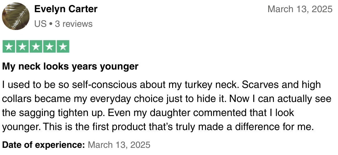 I honestly didn’t think anything could help my turkey neck, it’s been bothering me for years. After a few weeks using this cream I noticed my skin is tighter and that saggy look is way less. Even my daughter said my jawline looks sharper now lol. It’s not like I’m suddenly 20 again but the difference is real, I feel more comfortable wearing my hair up now.