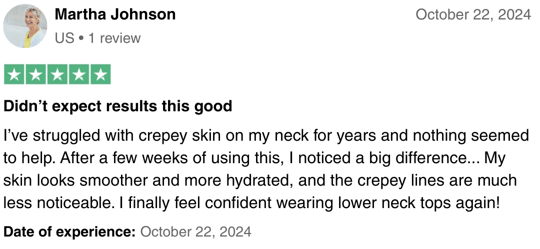 I started using this cream on July 5th and my neck was so thin and crepey looking, like tissue paper. By July 27th I could already see the skin looking a little stronger, not as wrinkly. Now it’s August 18th and I’m honestly shocked when I look in the mirror. the crepey lines are way less noticeable and my skin feels firmer. I never thought anything would work on my neck at my age, but this really is making a difference.